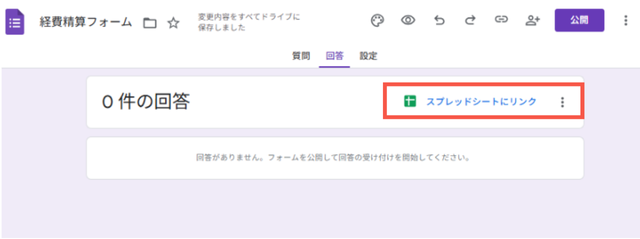 Google フォーム「回答」のタブから「スプレッドシートにリンク」をクリックし、申請データが自動的に記録されるようにします。申請があると同時にスプレッドシートにデータが追加されるため、常に最新の申請状況を把握でき、このスプレッドシートが、経費精算の管理台帳となります。