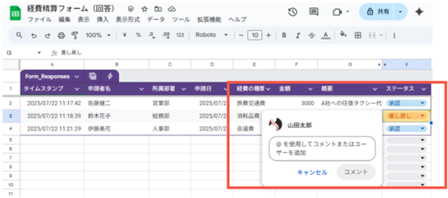 スプレッドシートのコメント機能を使うことで、承認者は申請者への質問や差戻しの理由を直接書き込むことができます。このとき、申請者のメールアドレスを「@マーク」で入力することで、申請者へ通知を送れます。