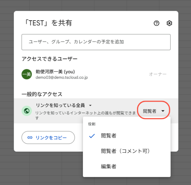 - メールアドレス右側の共有権限をクリックして、「閲覧者」「閲覧者(コメント可)」「編集者」のいずれかを選択