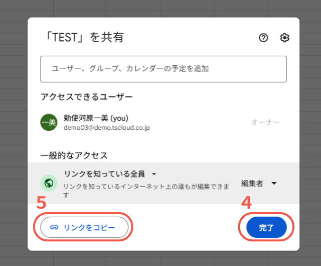 - 共有したいユーザーのメールアドレスまたはグループを入力(複数名の入力が可能)