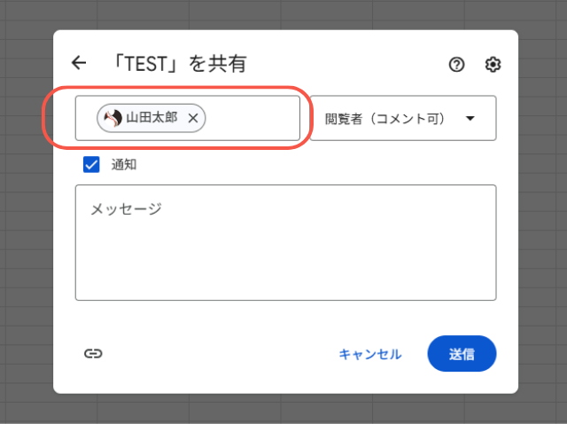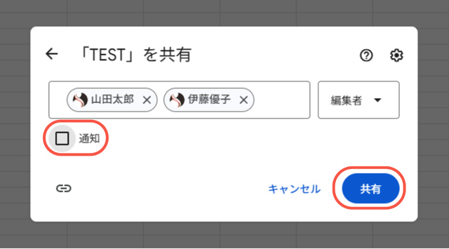 「通知」にチェックを入れない場合は、右下のボタンが「共有」になります。共有しても自動で相手方に通知されないため、ご自身でメールなどを利用してURLを送信するなど、相手方にスプレッドシート共有を伝える必要があります。