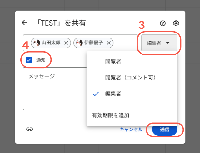 - 共有の権限を「閲覧者」「閲覧者(コメント可)」「編集者」のいずれかを選択