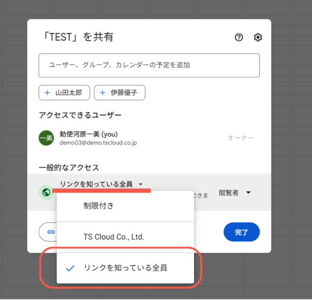 - 「一般的なアクセス」で「リンクを知っている人全員」を選択