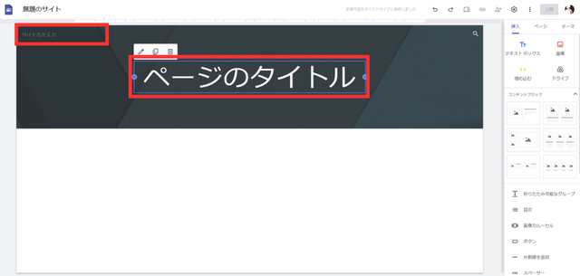作成画面が表示されたら、サイト名とトップページのタイトルを入力します。
