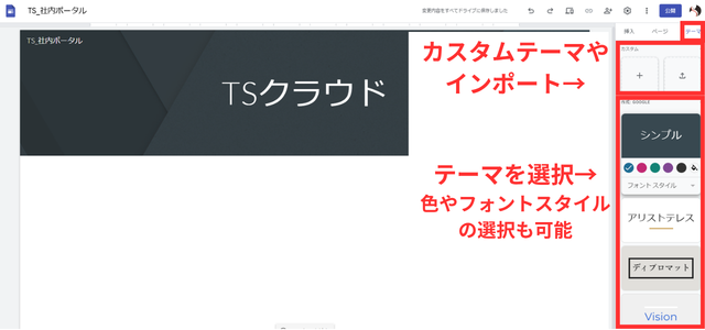 画面右側の「テーマ」タブから、サイト全体のデザインを決めます 。社内ポータル作成の場合は、コーポレートカラーや企業ロゴとのバランスを調整しながら色味やフォントスタイルを選択することで統一感のあるデザインに仕上げることができます。