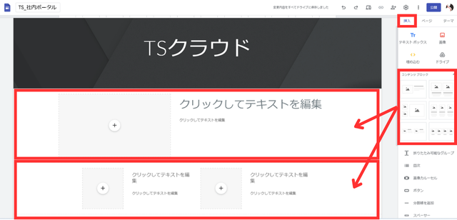 「挿入」タブから、「テキストボックス」や「画像」を選択してページに追加します 。あらかじめレイアウトが組まれた「コンテンツブロック」を活用すれば、画像と説明文をきれいに並べることができ便利です。