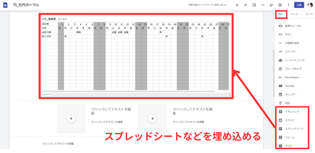 Google サイトの真骨頂はここからです。「挿入」タブの下部にある一覧から、Google カレンダー、Google ドライブ内のファイル(ドキュメント、スプレッドシート、スライド)、Google フォーム、YouTube 動画などを選択して埋め込むことができます。