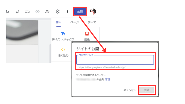 作成が完了したら、右上の「公開」ボタンをクリックし、ウェブアドレスを入力します。社内ポータルサイトの場合は、公開範囲を「社内限定(組織のユーザーのみ)」に制限するとよいでしょう。公開完了後、設定したウェブアドレスにアクセスし、正しく公開されているか確認します。
